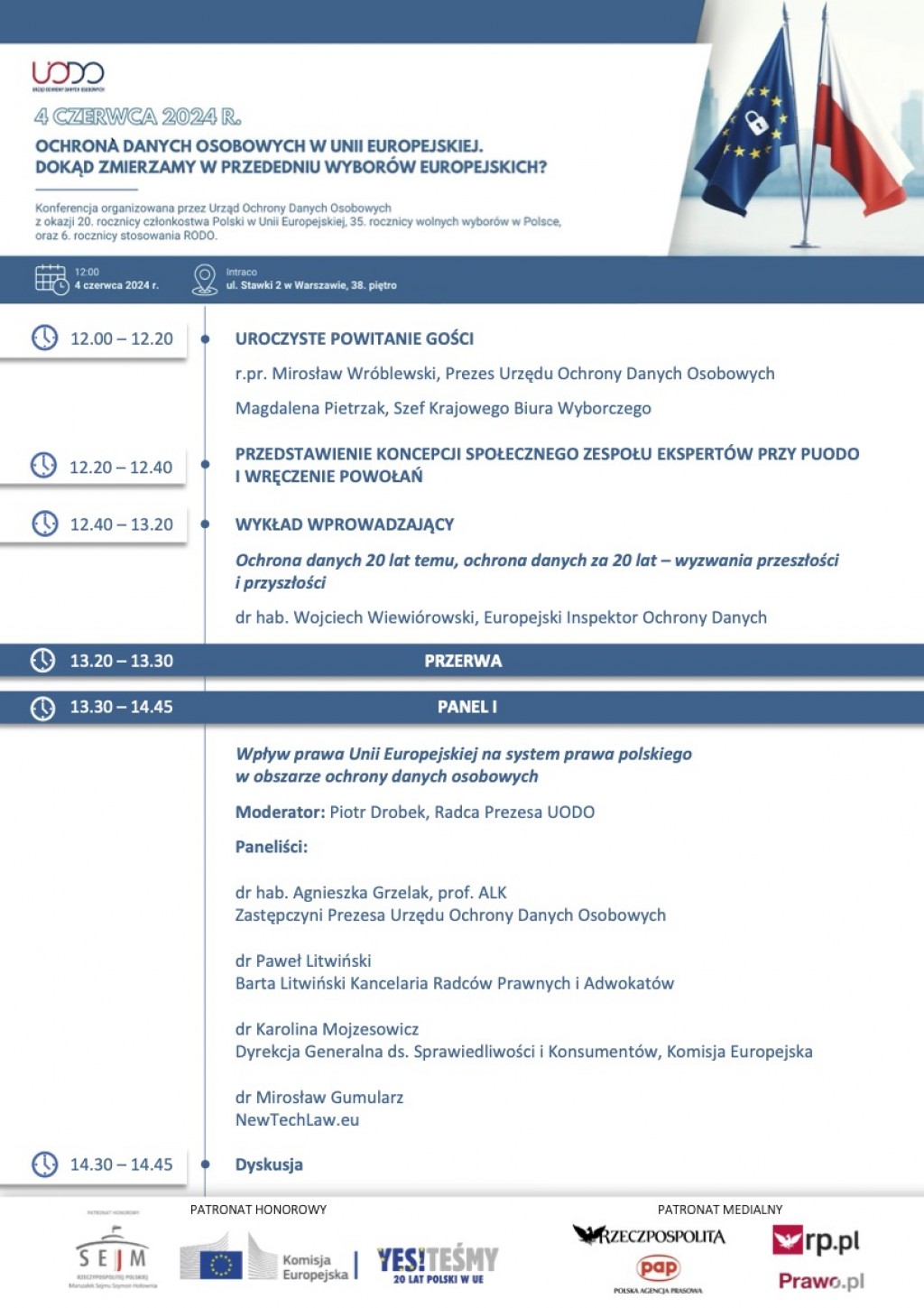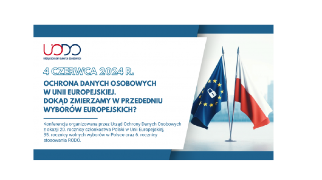 On 4 June 2024, the Personal Data Protection Office is organising a conference during which experts form the Personal Data Protection Office and invited guests will talk about the experiences of Polish and European personal data protection law. The event is organised on the occasion of the 20th anniversary of Poland's membership in the European Union, the 35th anniversary of free elections in Poland, the 6th anniversary of the application of the GDPR and in the context of the upcoming elections to the European Parliament.