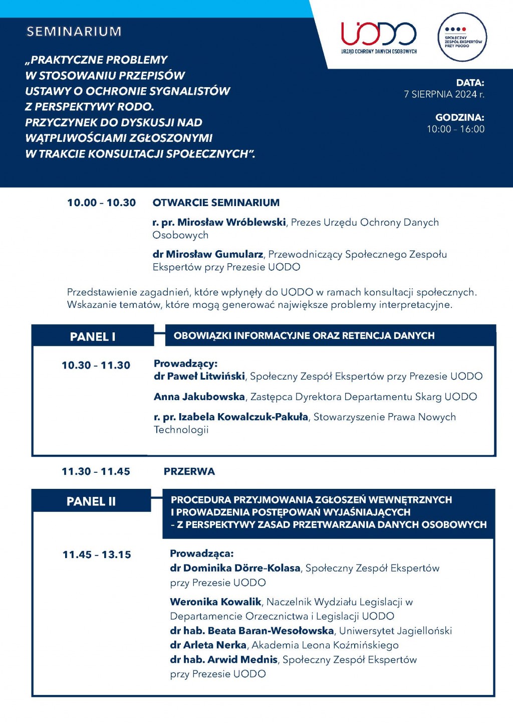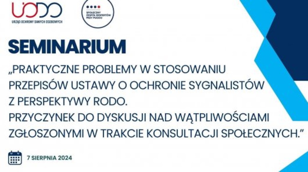On 7 August, the President of the Personal Data Protection Office together with the Social Team of Experts to the President of the Personal Data Protection Office will organise a seminar entitled "Practical problems in the application of the provisions of the The Act on the Protection of Whistleblowers from the perspective of the GDPR. A contribution to the discussion on the doubts raised during the public consultations."