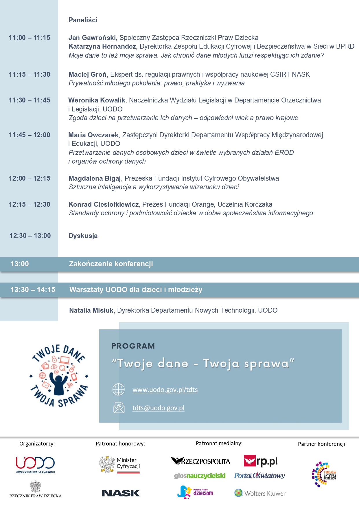 Zaproszeni eksperci opowiedzą o najważniejszych problemach oraz dobrych praktykach w zakresie ochrony prywatności i danych osobowych dzieci i młodzieży. Podczas wydarzenia poruszone zostaną kwestie dotyczące podmiotowości dzieci i potrzeby respektowania ich zdania oraz standardów ochrony ich praw w dobie dynamicznego rozwoju technologicznego i wyzwań dla ochrony danych osobowych w związku z powszechnym wykorzystywaniem sztucznej inteligencji. Przedstawione zostanie również podejście państw członkowskich UE do skutecznej ochrony danych osobowych najmłodszych. Wśród zaproszony prelegentów jest m.in. Minister Cyfryzacji Krzysztof Gawkowski, Rzeczniczka Praw Dziecka Monika Horna-Cieślak, Podsekretarz Stanu w Ministerstwie Sprawiedliwości Zuzanna Rudzińska-Bluszcz oraz Magdalena Wilczyńska, Dyrektorka Pionu Ochrony Informacyjnej Cyberprzestrzeni w NASK.