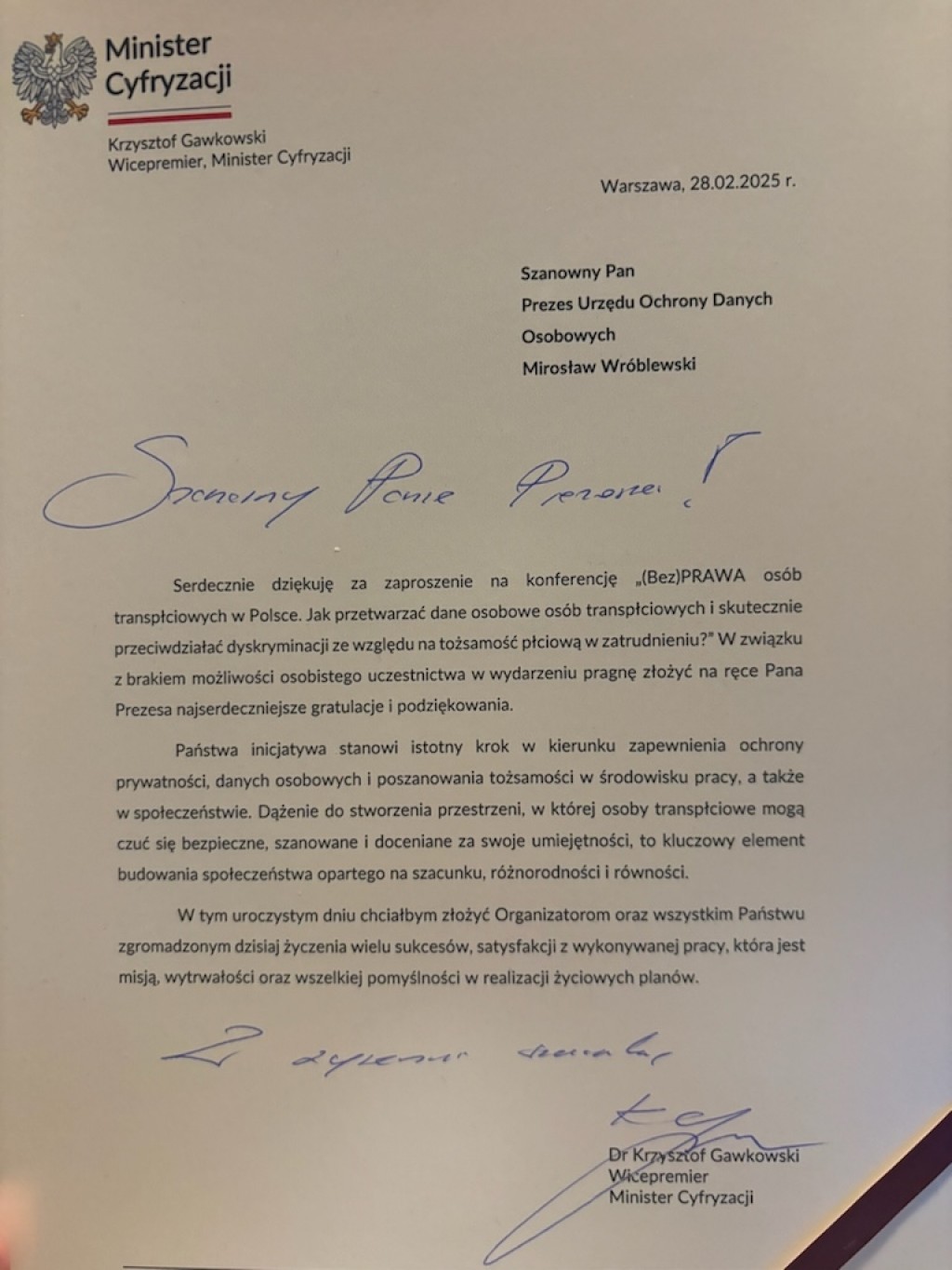 Odczytano list wicepremiera, Ministra Cyfryzacji, Krzysztofa Gawkowskiego, w którym podkreślił poparcie dla zapewnienia ochrony prywatności, danych osobowych i poszanowania tożsamości w środowisku pracy i społeczeństwie.