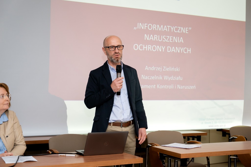 Konrad Komornicki, zastępca Prezesa UODO, przywitał gości, zwracając uwagę na znaczenie ochrony danych osobowych i na to, jak duże znaczenie odgrywają one w życiu każdego człowieka. Dziękując Jego Ekscelencji Markowi Marczakowi i ks. prof. Piotrowi Kroczkowi za otwartość, wrażliwość i zrozumienie tej problematyki w Kościele katolickim, podkreślił, że buduje to ważny element zaufania wiernych. Kończąc wypowiedź, wyraził nadzieję, że szkolenie stało się również okazją do wymiany doświadczeń i wypracowania wspólnych metod dalszej współpracy UODO-KIOD, skupiającej się na podnoszeniu świadomości w obszarze o ochrony danych osobowych.