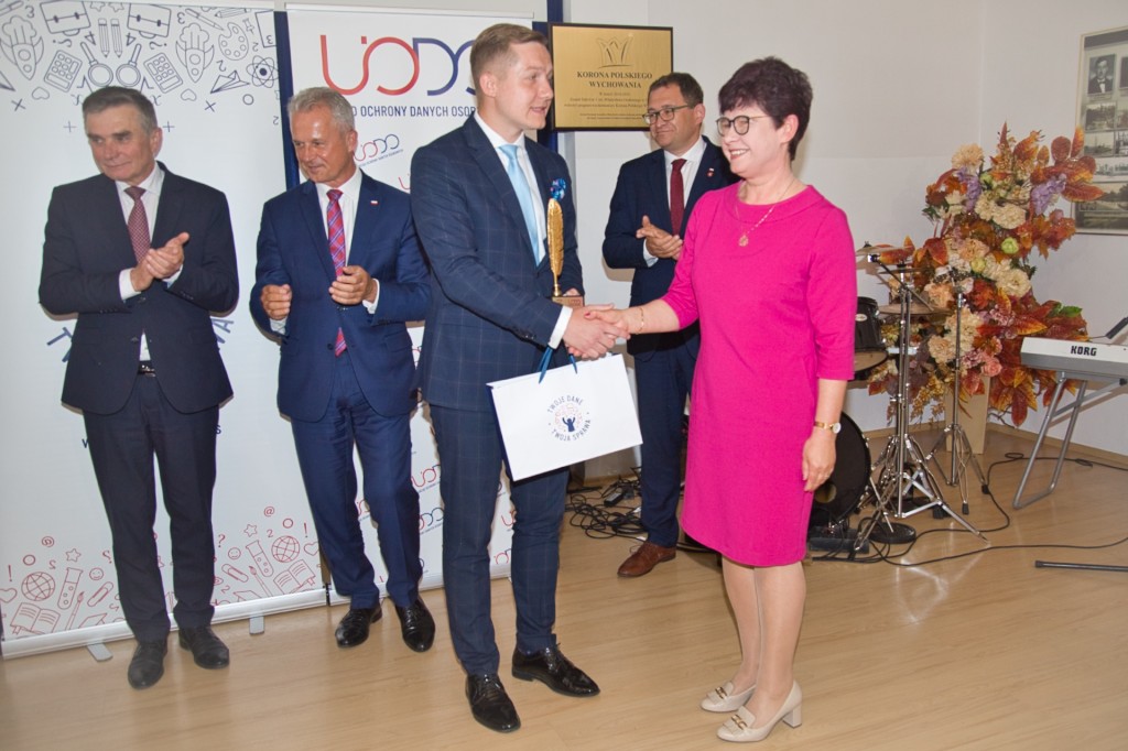 Nagrodę główną „Złote Pióro” z rąk Jakuba Groszkowskiego, Zastępcy Prezesa UODO, odebrała Elżbieta Sękowska, dyrektor ZS nr 1 w Lublinie, gdzie 14 czerwca 2023 r. odbyło się uroczyste wręczenie nagród wszystkim laureatom konkursów zorganizowanych przez UODO w ramach bieżącej edycji programu.