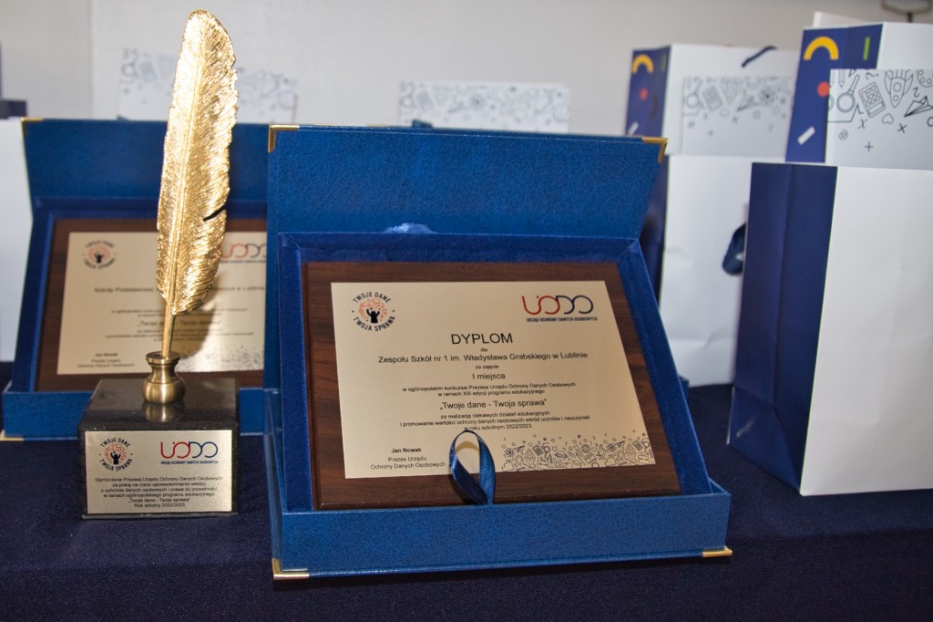 Prezes UODO wyróżnił Zespół Szkół nr 1 im. Władysława Grabskiego w Lublinie statuetką „Złotego Pióra”. Wyróżnienie jest przyznawane tej szkole, która zrealizuje najciekawsze inicjatywy edukacyjne w ramach programu edukacyjnego „Twoje dane - Twoja sprawa”. W tym roku szkolnym lubelska placówka triumfowała nie tylko w konkursie dla szkół, w którym zdobyła I miejsce, ale także w konkursie dla uczniów, zajmując II lokatę.