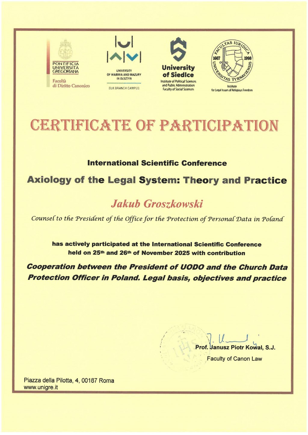 Urząd Ochrony Danych Osobowych uczestniczył w międzynarodowej konferencji naukowej „Axiology of the Legal System: Theory and Practice” (Aksjologia systemu prawnego: teoria i praktyka), która 25 i 26 listopada odbyła się na Papieskim Uniwersytecie Gregoriańskim w Rzymie. Przedstawicielem Urzędu podczas wydarzenia był Jakub Groszkowski, Główny koordynator w UODO ds. ochrony danych w Kościołach i związkach wyznaniowych.