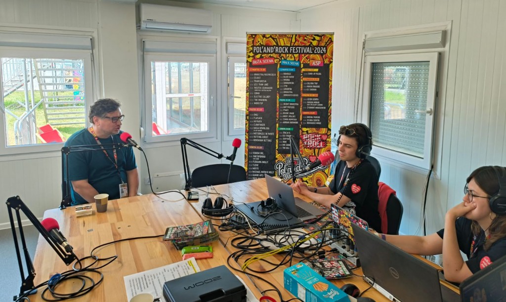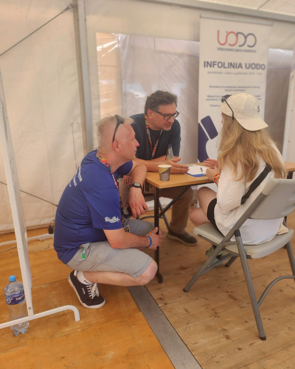 Zdjęcie przedstawiające Mirosława Wróblewskiego, prezesa UODO, oraz innego uczestnika rozmawiających z zainteresowaną osobą (młoda dziewczyna w bajsbolówce) Zdjęcie przedstawiające pracownicę Infolinii Izabelę Maryańską na stanowisku Infolinii z osobą, która poprosiła o poradę. Zdjęcie przedstawiące Mirosława Wróblewskiego, prezesa UODO, w studiu radiowym podczas Pol’and’Rock Festiwal. Zdjęcie przedstawiające Mirosława Wróblewskiego, prezesa UODO (w środku), po prawej stronie od prezesa - Izabela Maryańska, pracownik Infolinii UODO, po lewej Tomasz Ochmiński, dyrektor Departamentu Nowych Technologii przed sceną podczas Pol’and’Rock Festiwal.